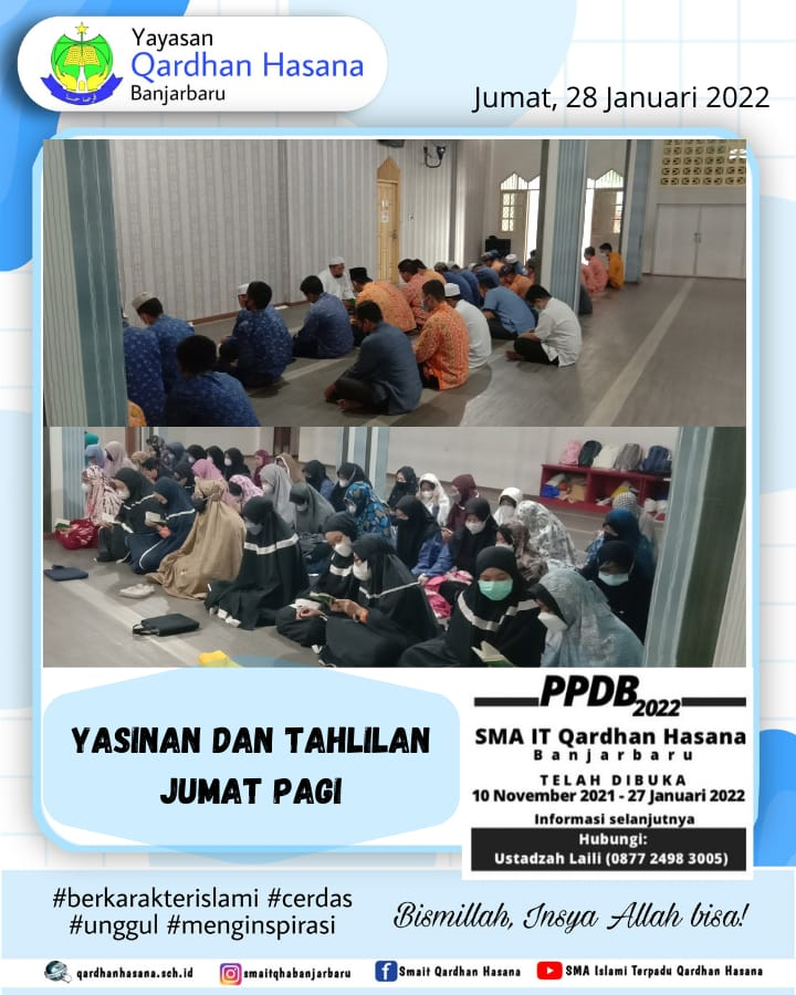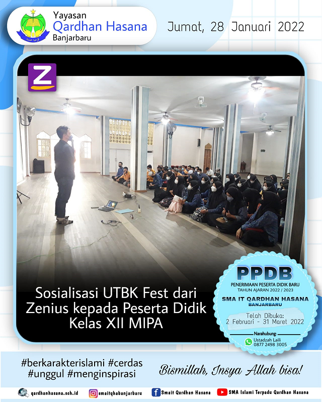 Alhamdulillah. Telah terlaksana kegiatan Sosialisasi UTBK Fest dari Zenius yang merupakan platform edukasi berbasis teknologi kepada Peserta Didik Kelas XII MIPA SMA IT Qardhan Hasana Banjarbaru pada hari Jum'at, . . . 0